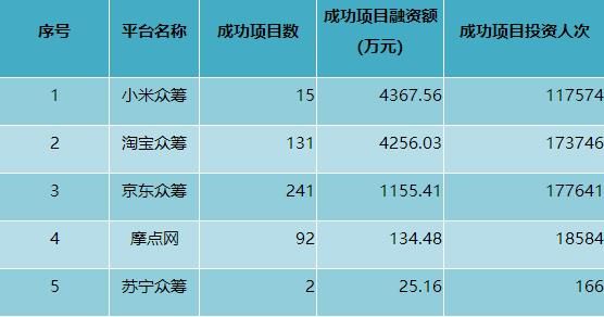 本月报选取了5家权益型众筹平台作为分析样本,这5家平台分别是小米众筹、苏宁众筹、淘宝众筹、京东众筹、摩点网。