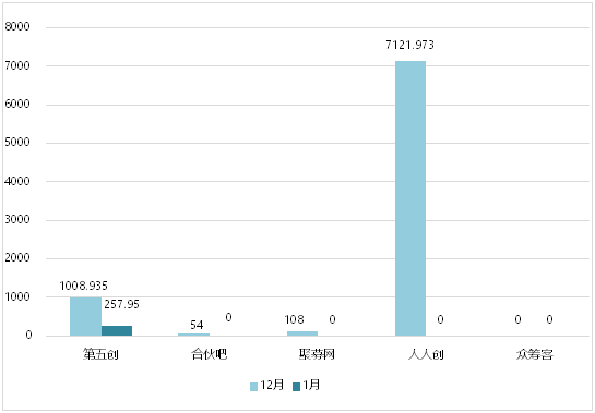 2020年1月5家股权型众筹平台在1月共成功2个项目,与上月相比下降幅度较大。仅有第五创平台有2个项目,其12月则为13个。其他4个平台项目数相比上月均下降。