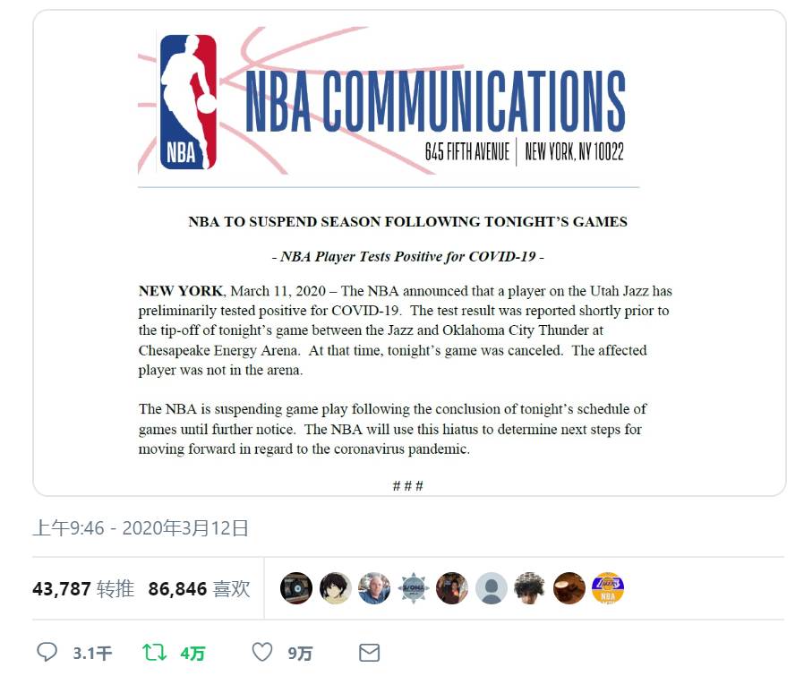 官方写道:“一名爵士球员在新冠病毒初步检测中呈阳性,这个结果是在今晚雷霆与爵士的赛前上报的,雷霆和爵士的比赛已经被取消。感染的球员并没有在球馆里。官方将在今晚的比赛之后暂停本赛季直到另行通知。NBA将利用这一空档来决定下一步如何应对新冠病毒的流行。”
