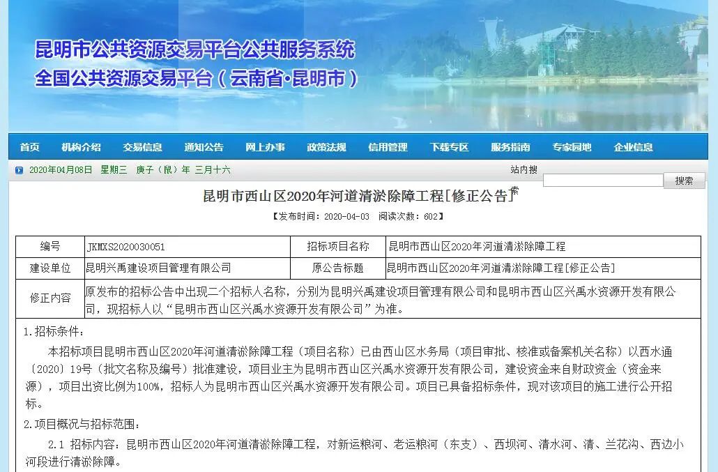 4月3日,昆明市公共资源交易平台发布《昆明市西山区2020年河道清淤除障工程[修正公告] 》,此次招标内容主要为昆明市西山区2020年6条河道清淤除障工程项目。10 “周边都150,为何收我们300?”昆明一小区住户质疑车位收费不合理