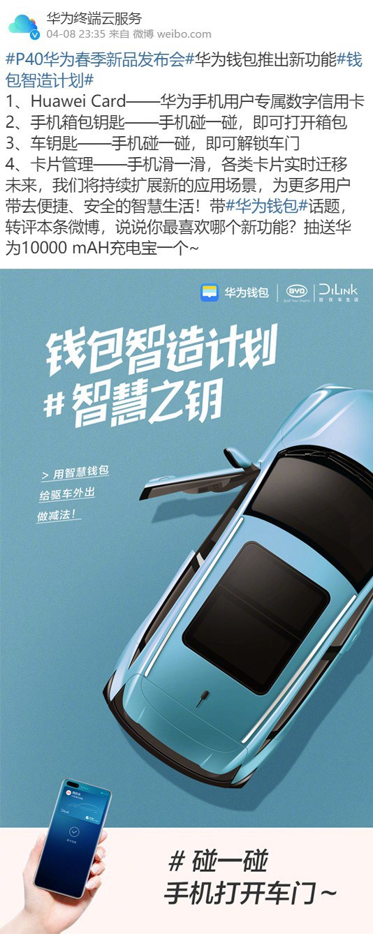 4月8日晚,华为手机召开年度首款旗舰新品P40国内发布会,于方寸之间,造“声”势磅礴。华为P40的面世不仅展示了华为对5G技术的成熟应用,同时也意味着其与比亚迪Dilink联手打造的手机NFC车钥匙功能即将正式投入使用。