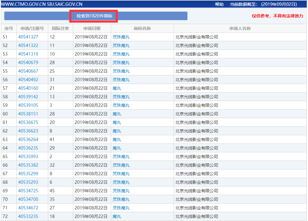 7月26日《哪吒》电影首映,8月9日,光线日,可以看到抢注的商标内容涵盖《哪吒之魔童降世》的一切相关内容,包括灵珠魔丸、魔丸、魔童哪吒、哪吒之魔童降世、殷夫人、敖丙等。