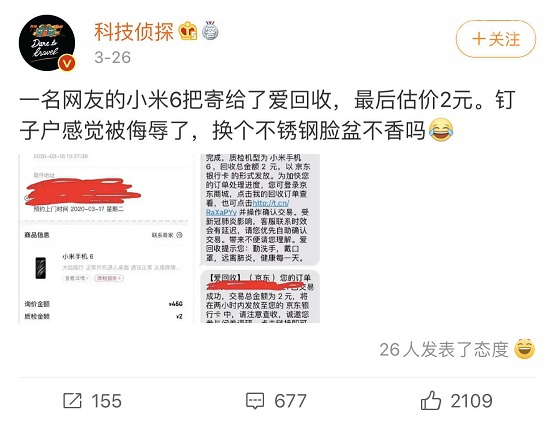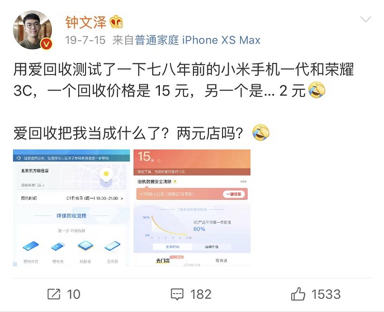 其实在去年7月,钟文泽还发过另一条微博,称他用爱回收测试了一下七八年前的小米手机一代和荣耀3C,一个回收价格是15元,另一个是2元。