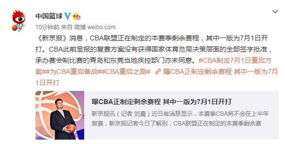 4月12日讯《新京报》消息,CBA联盟正在制定的本赛季剩余赛程,其中一版为7月1日开打。