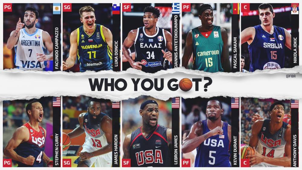 可以看到,FIBA挑出的世界队为坎帕佐、东契奇、字母哥、西亚卡姆和约基奇,美国队为库里、哈登、詹姆斯、杜兰特以及浓眉。