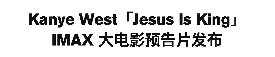 万众期待的 Kanye West 新专辑《Jesus Is King》目前暂定于 10 月 25 日正式发布,与这张专辑一同登场的则是侃爷量身打造的同名 IMAX 大电影《Jesus Is King》。近日,《Jesus Is King》正式发布首支预告片,借鉴《圣经》中马可福音的一段,尽显福音主题。目前《Jesus Is King》已在 IMAX 官网正式开票,但由于地区原因,该片无法登陆中国内地院线上映,有兴趣的朋友不妨期待一下《Jesus Is King》新专辑。