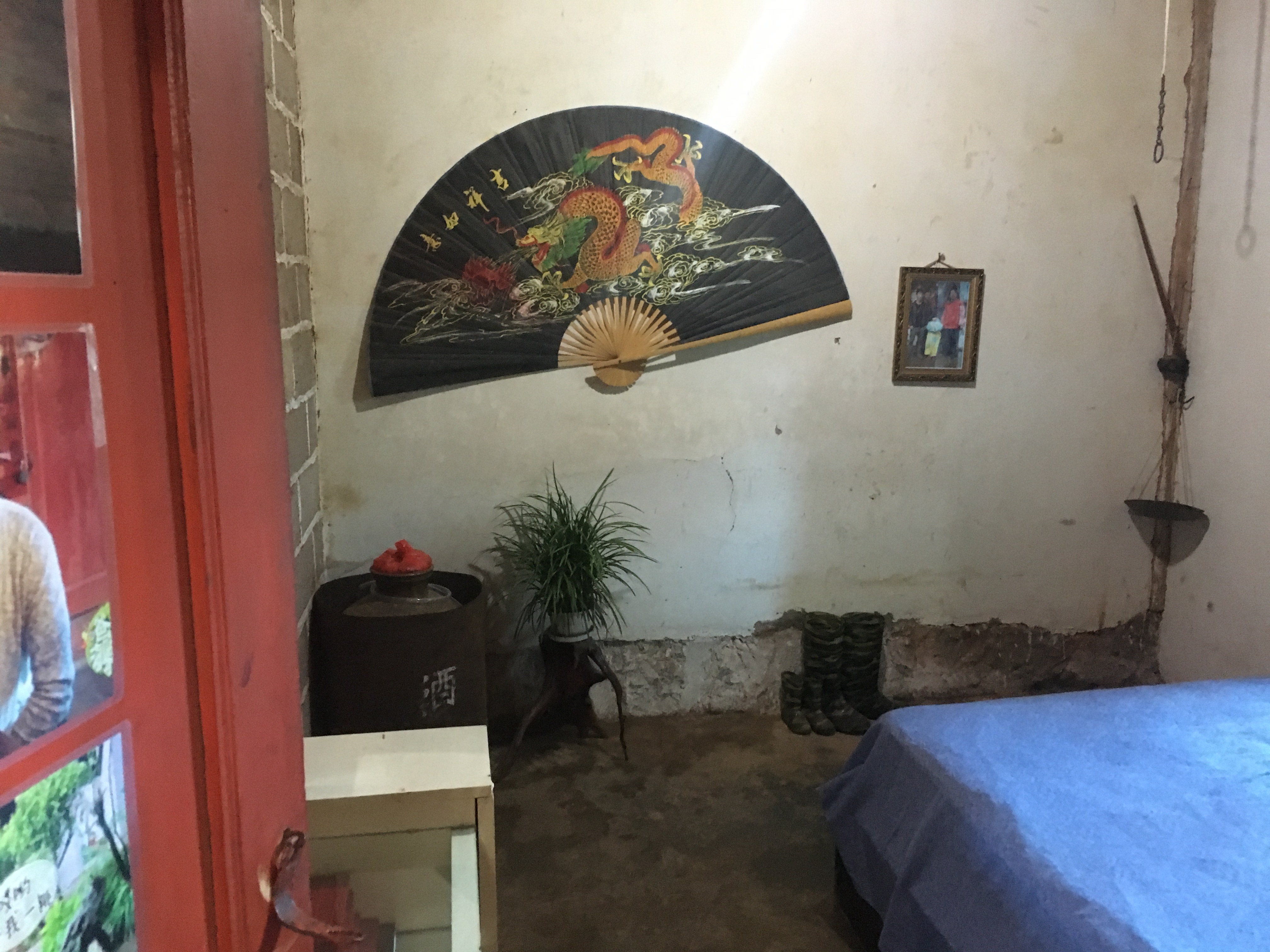离巷口最近的是4号房,节目中,这是王岳伦父女住的地方。屋主王奶奶今年77岁,探访当天,前去的游客并不多,原本应收的3元参观费,也被免了。屋子位于房间一进门右侧,记者看到,卧室还保留了节目中原有的样子,在卧室一角摆放的大小两双雨靴,也是当时拍摄节目时,王岳伦父女穿着的,鞋身还留有下田时沾有的泥土。