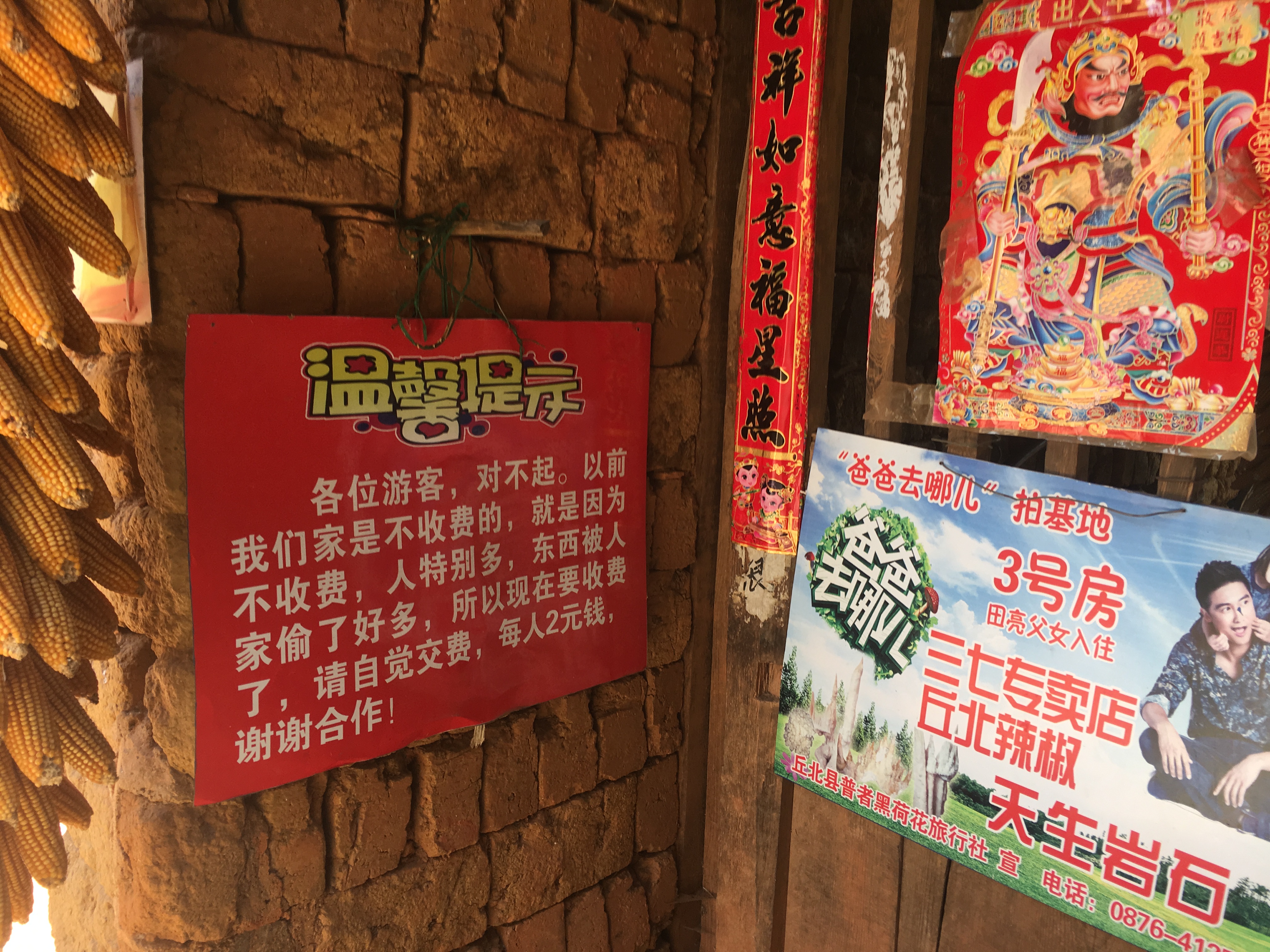 在田亮曾经居住的3号房,门口摆有一个说明牌,大意为“原本参观并不收费,但现在的收费是因为来的人多,丢了很多东西。”这个略显无奈的“招牌”是屋主在前年挂上的。屋主告诉记者,由于2013年之后大量的游客前来参观,自己家里的不少东西都被顺走,包括自己曾经收藏的不少石头,着急上火之余,从2017年开始每人收费两元。这两元的门票也可以算作户主打扫卫生的劳务费了,“有外人进来参观,我们肯定还要打扫屋子,毕竟一家人现在还住这里。”
