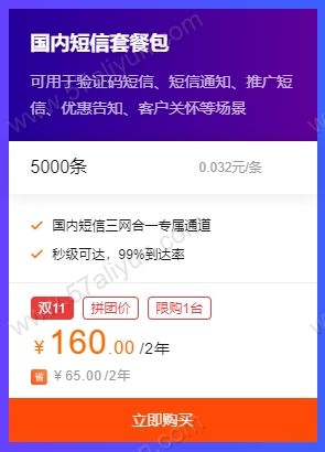 在双11活动期间,阿里云的各种云产品都在大搞促销活动,像什么云服务器86元/年,云数据库388元/年之类的。阿里云通信下面的短信服务质量在国内一直有口皆碑,他拥有国内短信三网合一专属通道,短信到达率高达99%,到达时效更是秒级达到。最近,阿里云短信服务也推出了超值的短信资源包;2年有效期的5000 条短信资源包仅售160元(阿里云原来的新用户体验价是225元),折合成本0.032元/条。