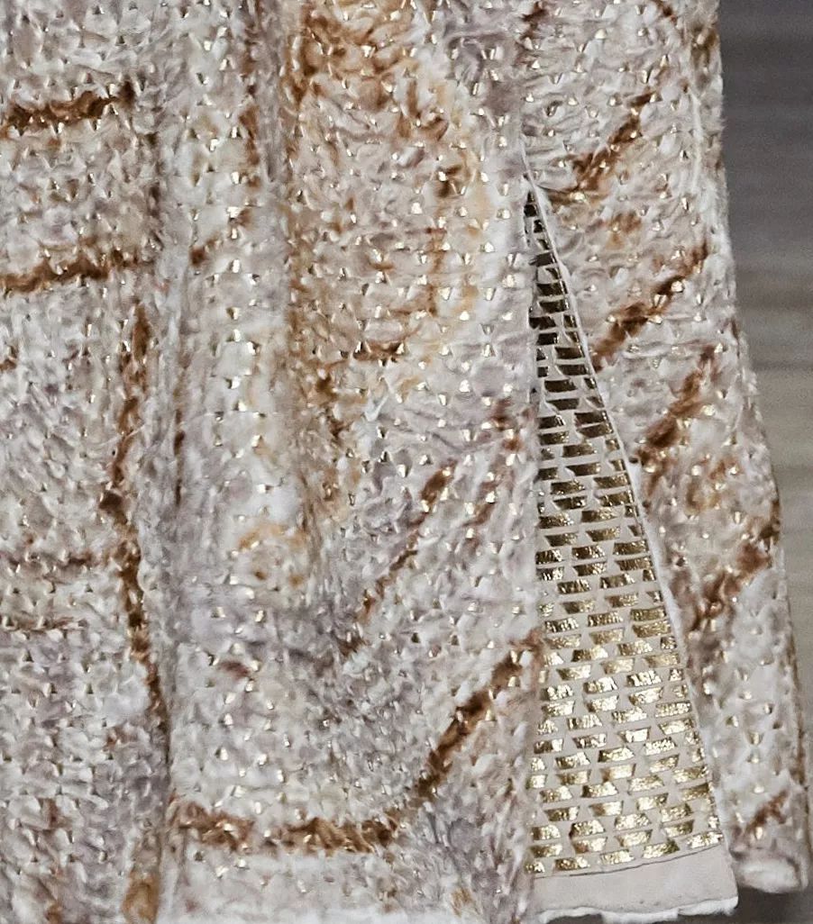 这是一件效果极为惊艳的卡拉库羊毛外套,羊毛上印大理石纹图案,同时上又闪烁着点点的金光。通过大衣底摆微微翻起的部分,我们可以看到工艺细节,在羊毛的皮板上割出排列有序的斜向刀口,之后把金属皮革裁切成细条,穿插到羊毛上,便呈现出仿佛在“大理石上嵌金”的效果。搭配长毛的狐狸毛翻领,显得极为华贵。