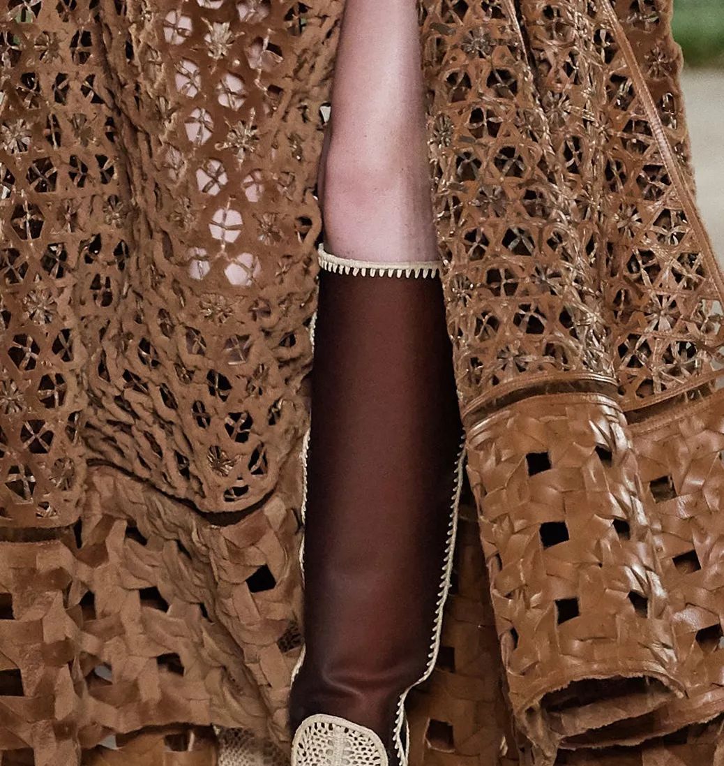 ▲FENDI 2019F Couture,皮草与皮革镂空拼接拖地大衣,底摆处以剪绒水貂镂空编织做装饰