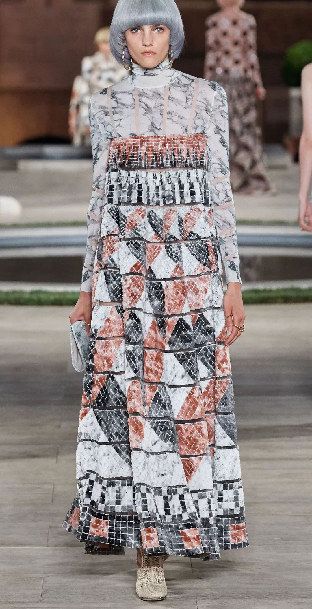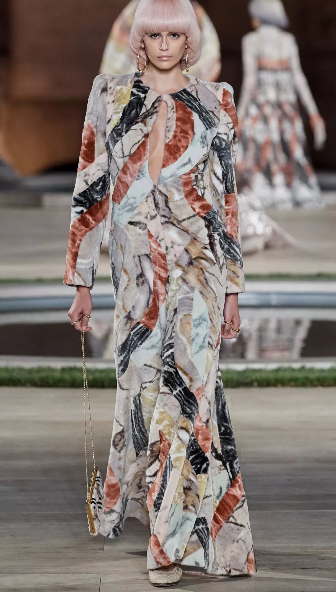 ▲FENDI 2019F Couture,水貂拖地长裙,剪绒水貂进行大理石图案印花,大身使用斜向拼接