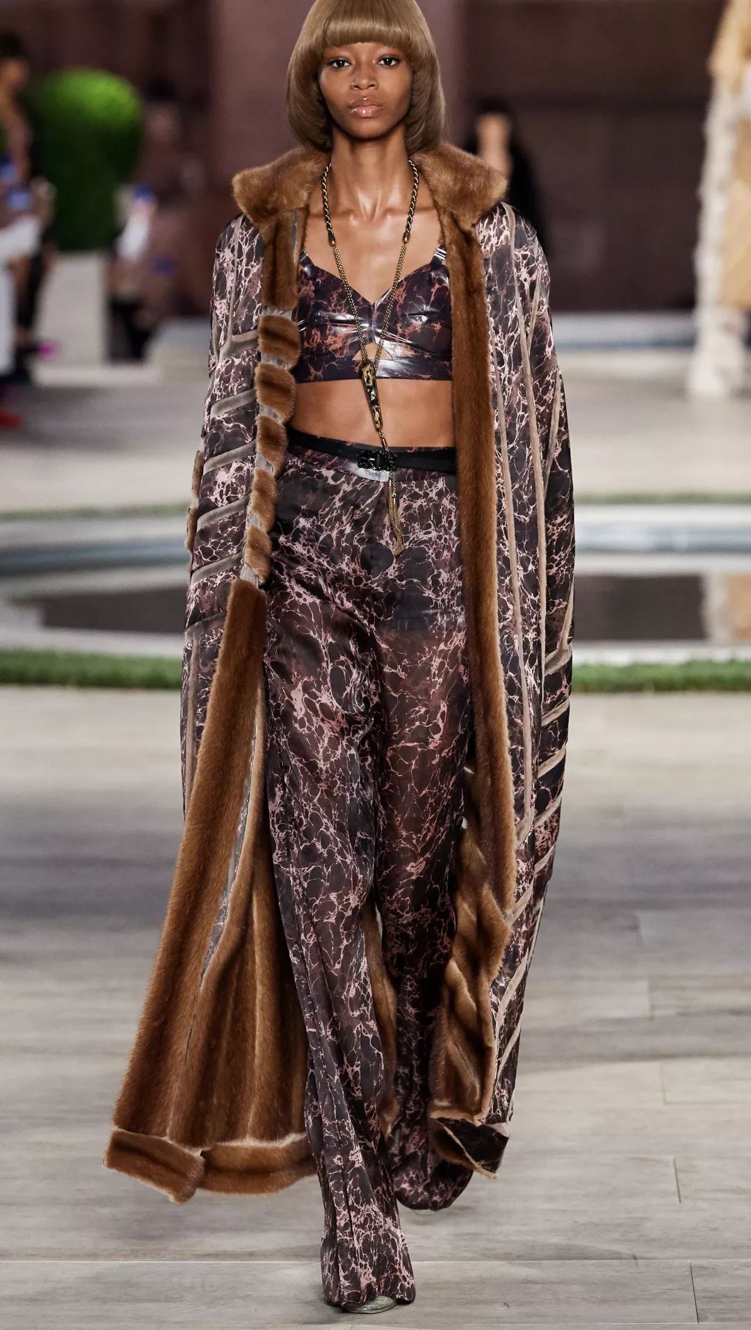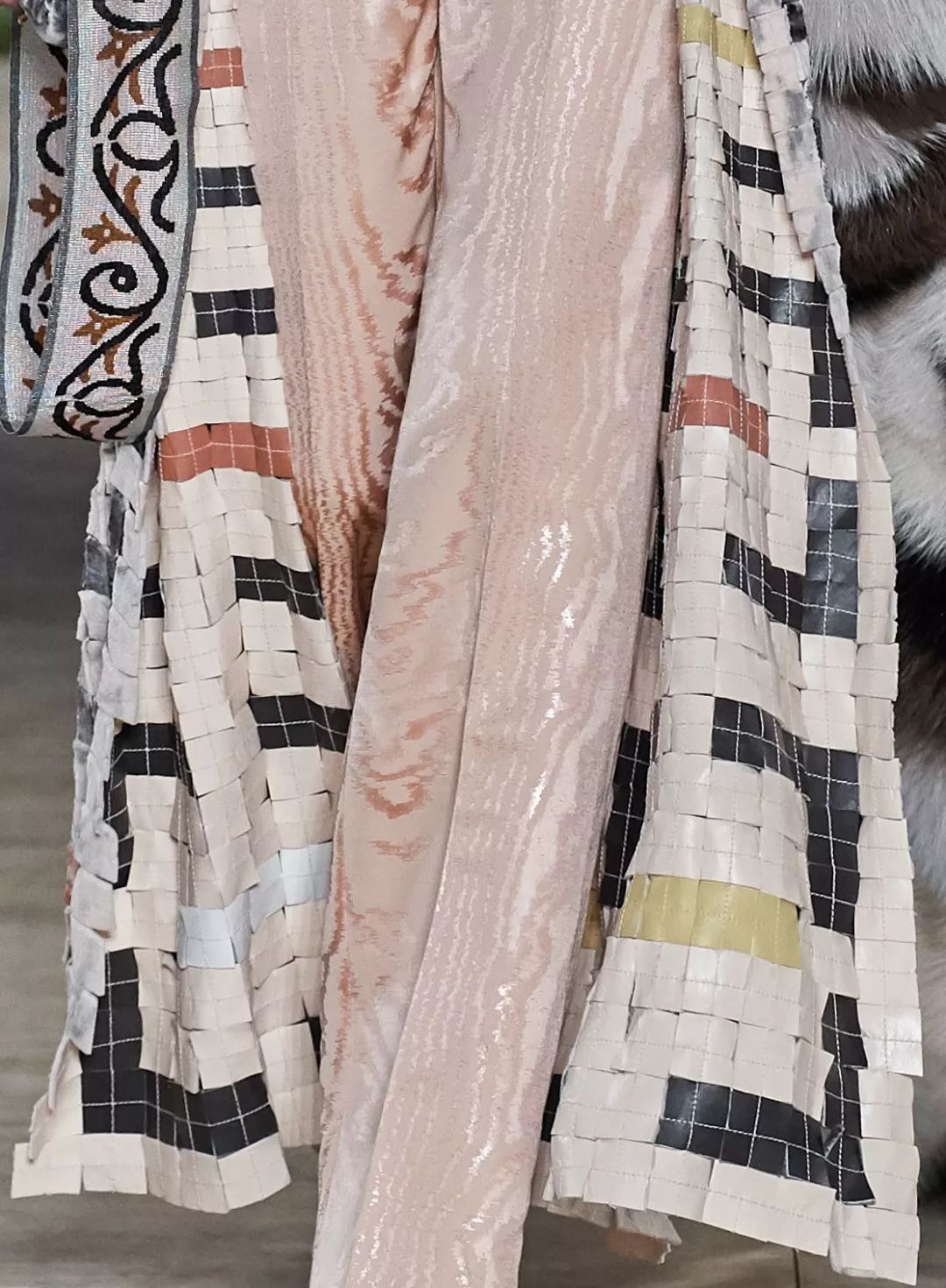 为了减轻整件皮草服装的重量,使皮草服装变得透气,同时也丰富整件衣服的层次感,FENDI大量使用了皮草与薄纱拼接的工艺。