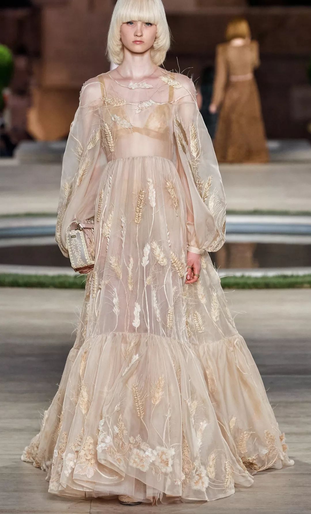 ▲FENDI 2019F Couture,薄纱拖地礼服裙,装饰以麦穗刺绣图案,部分图案点缀皮草