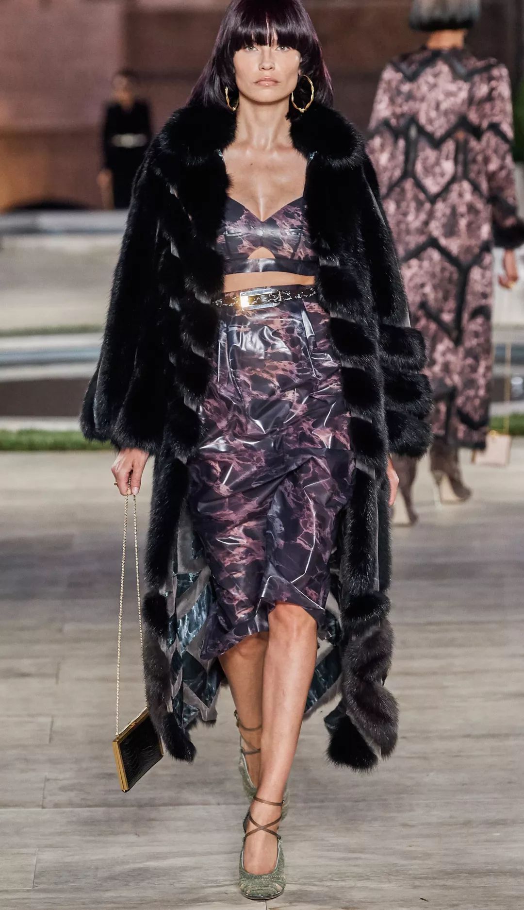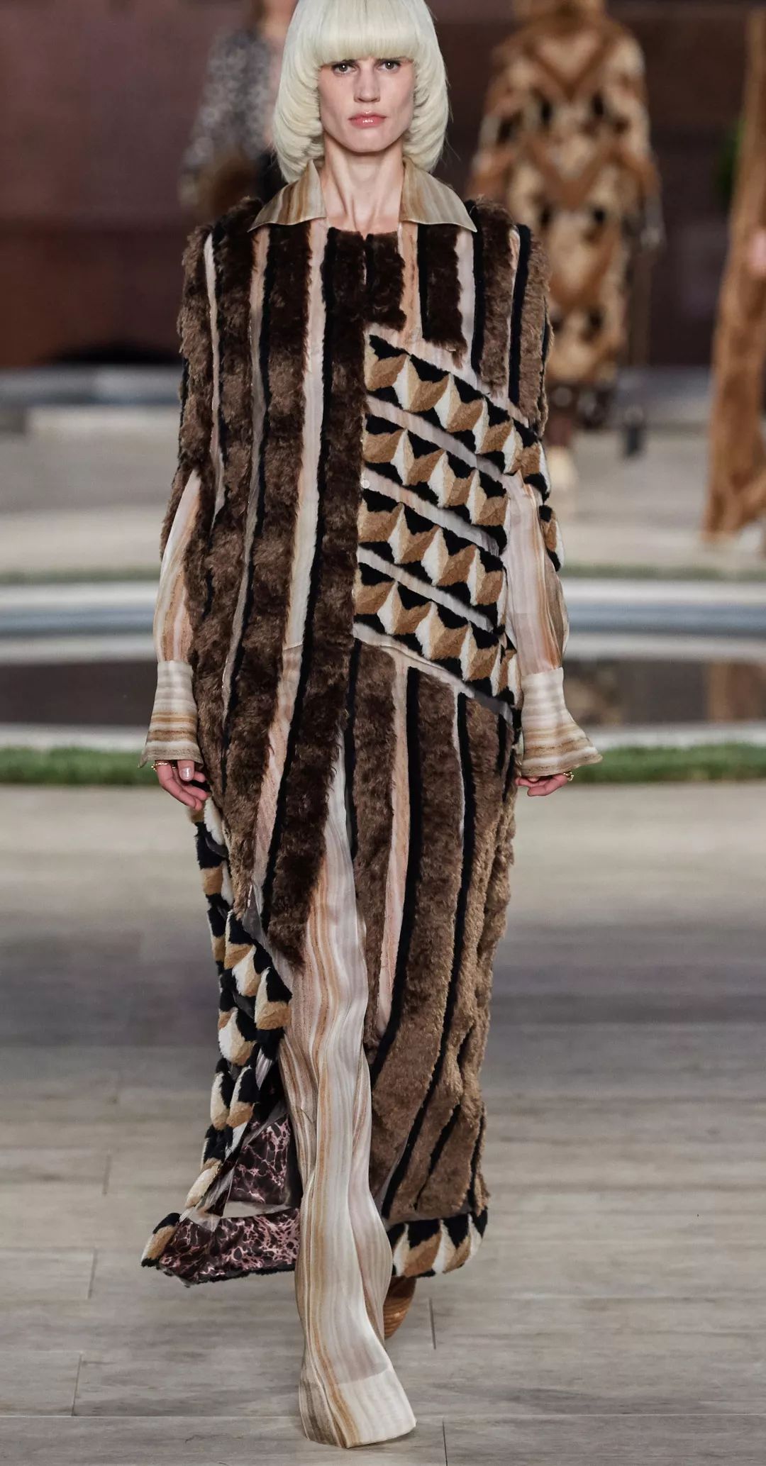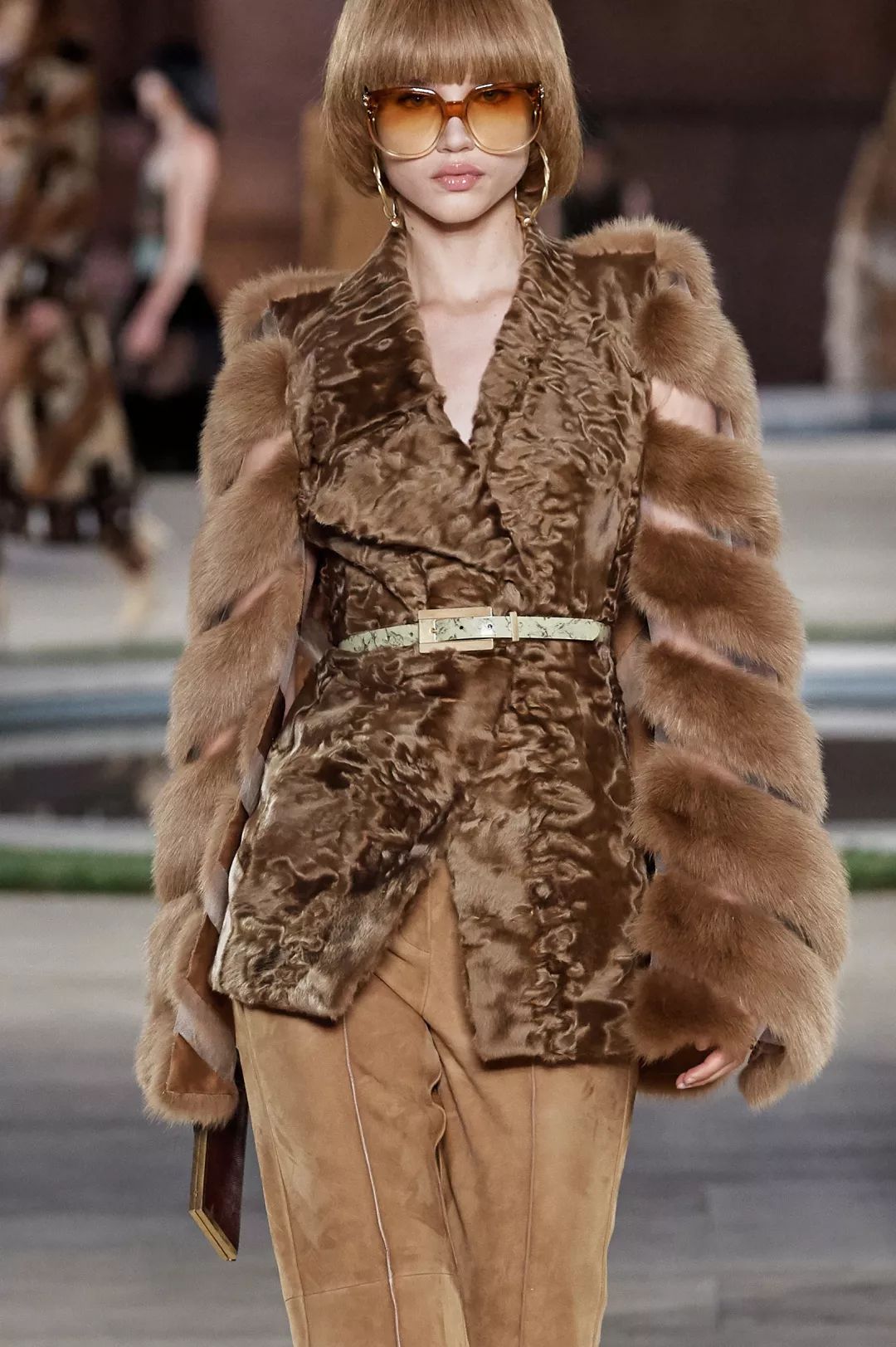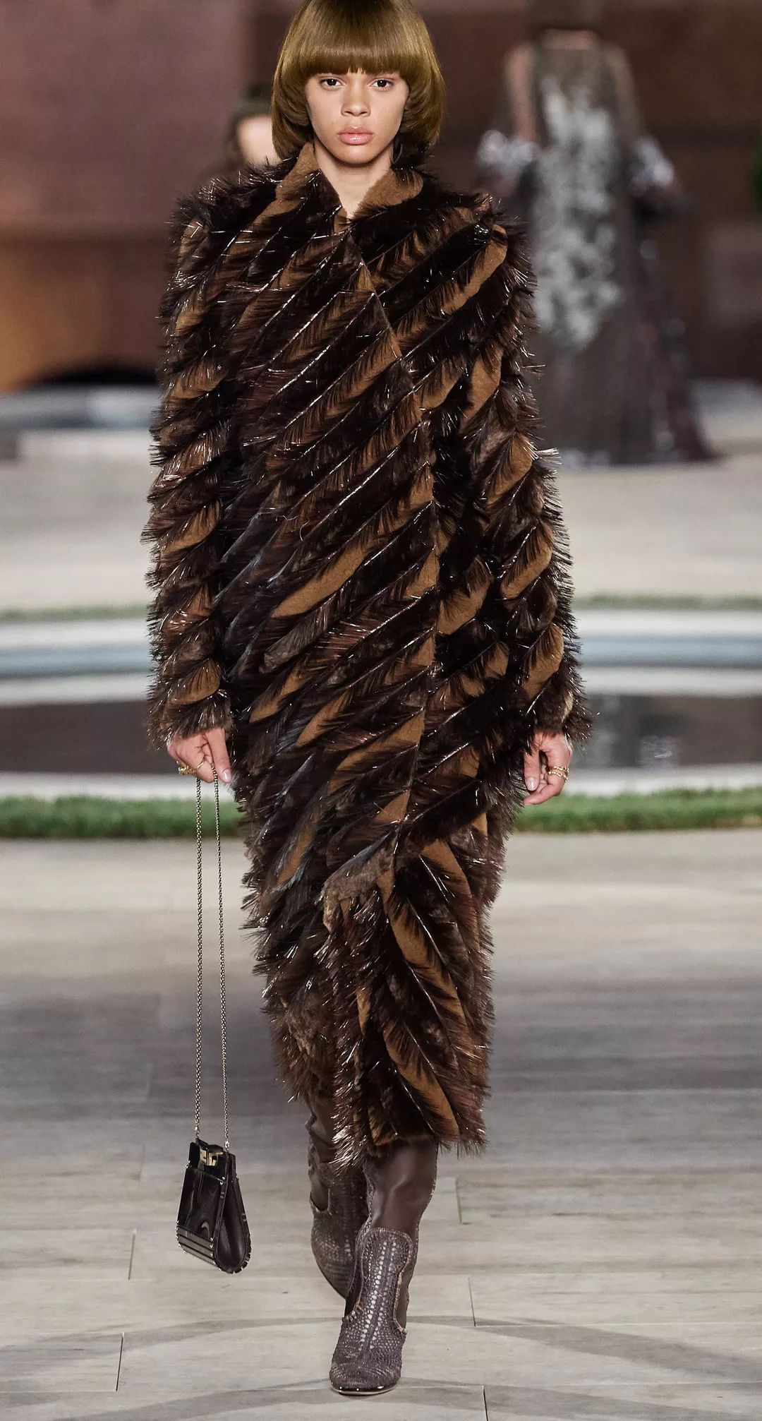 FENDI采用了有金属光泽的人造羽毛,穿插在斜拼的剪绒水貂的接缝处,令皮草呈现出前所未见的视觉效果。