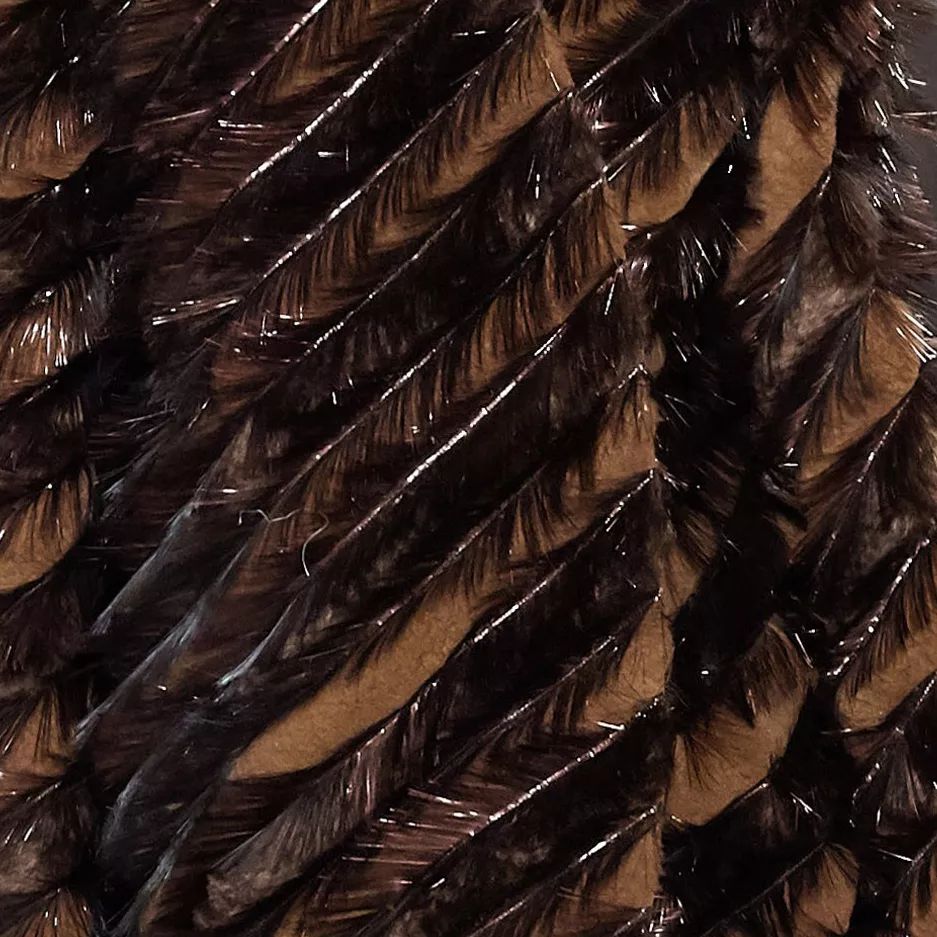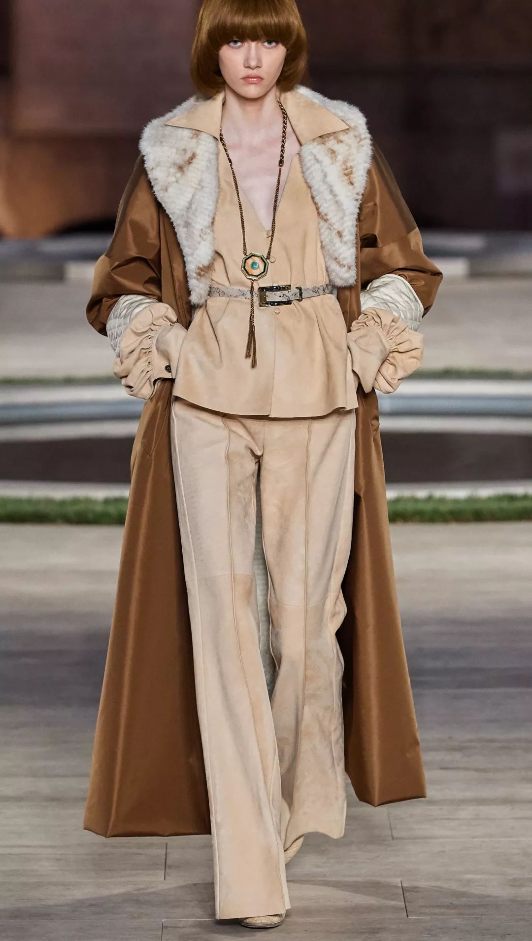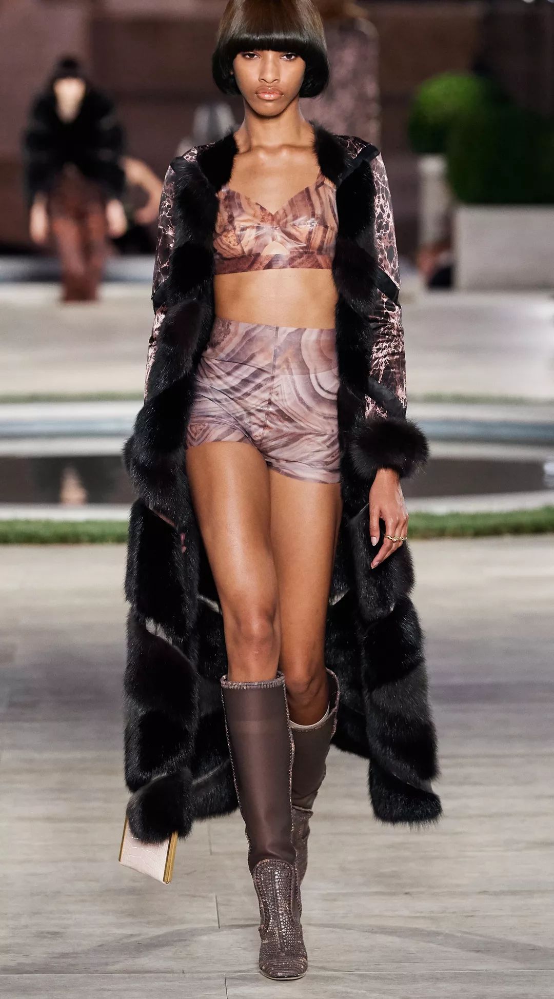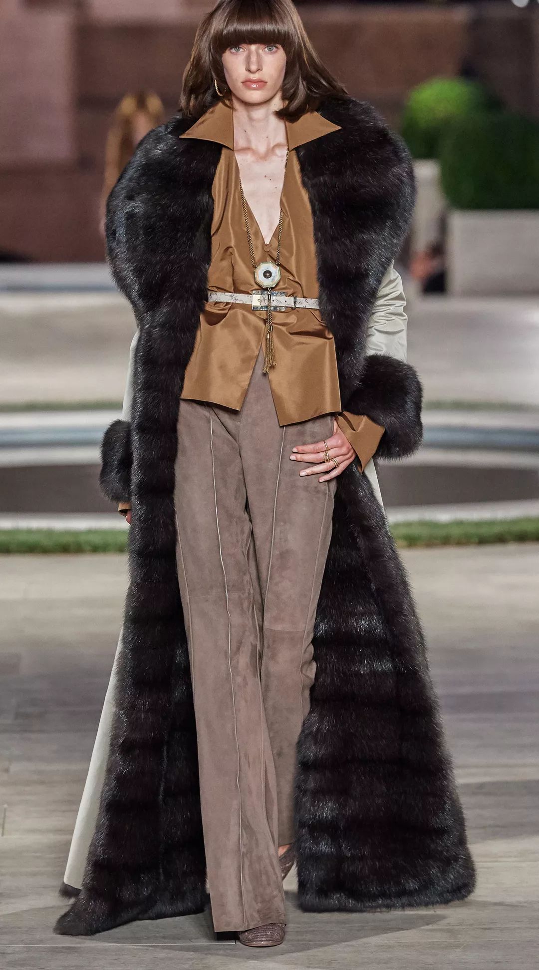 FENDI采用了有金属光泽的人造羽毛,穿插在斜拼的剪绒水貂的接缝处,令皮草呈现出前所未见的视觉效果。