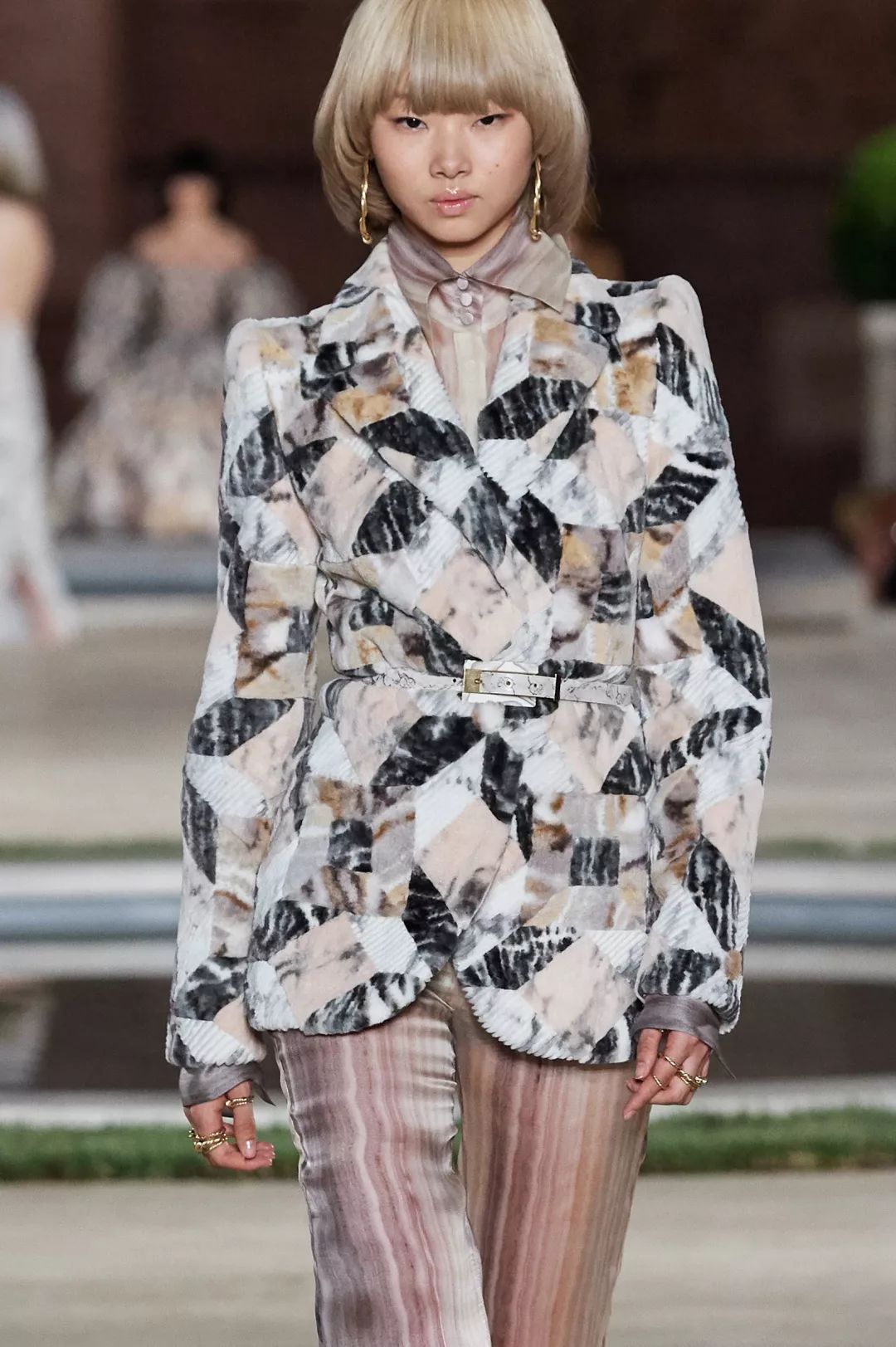 ▲FENDI 2019F Couture,水貂西装外套,剪绒水貂进行大理石图案印花,部分水貂进行剪坑工艺,整体采用几何图案拼接