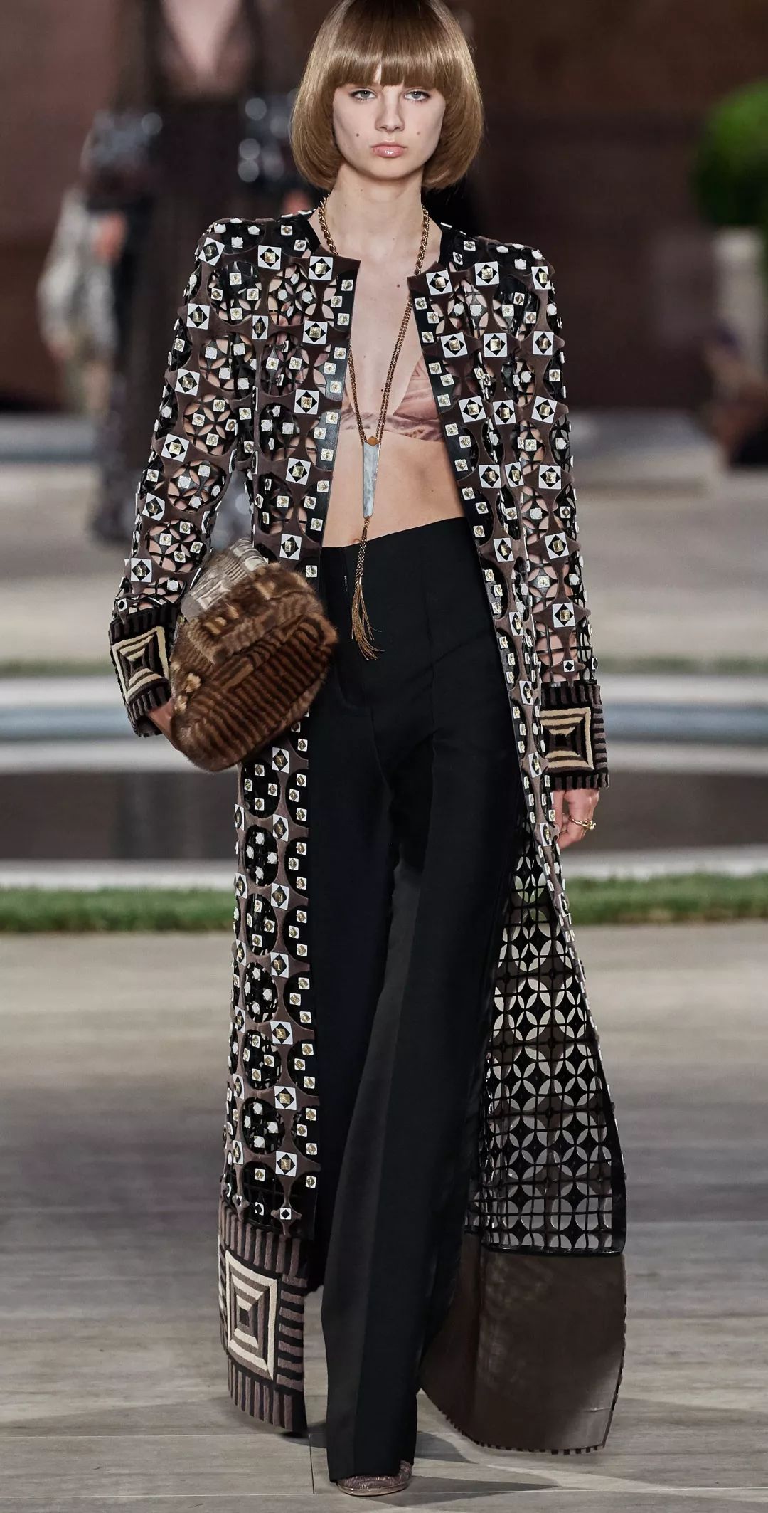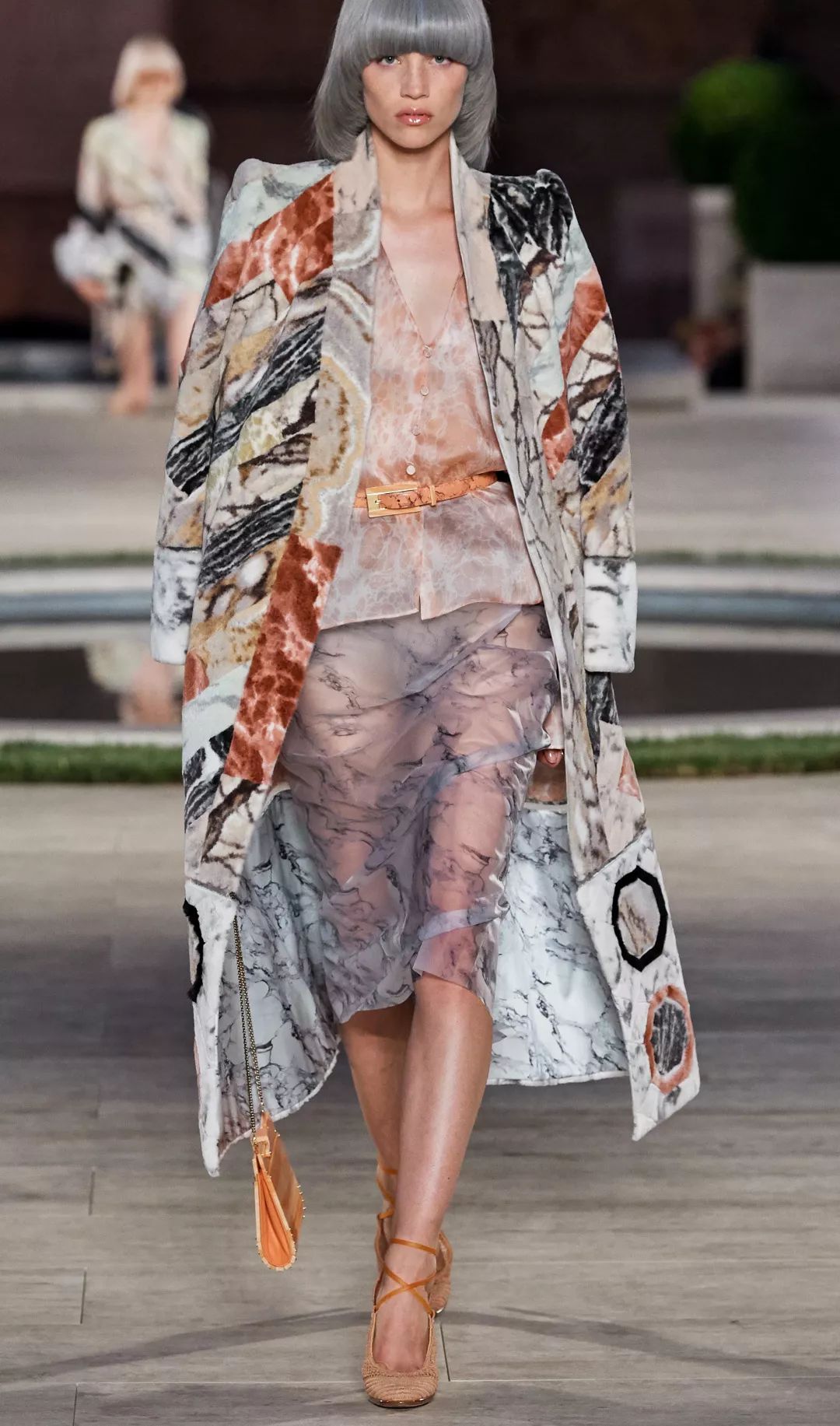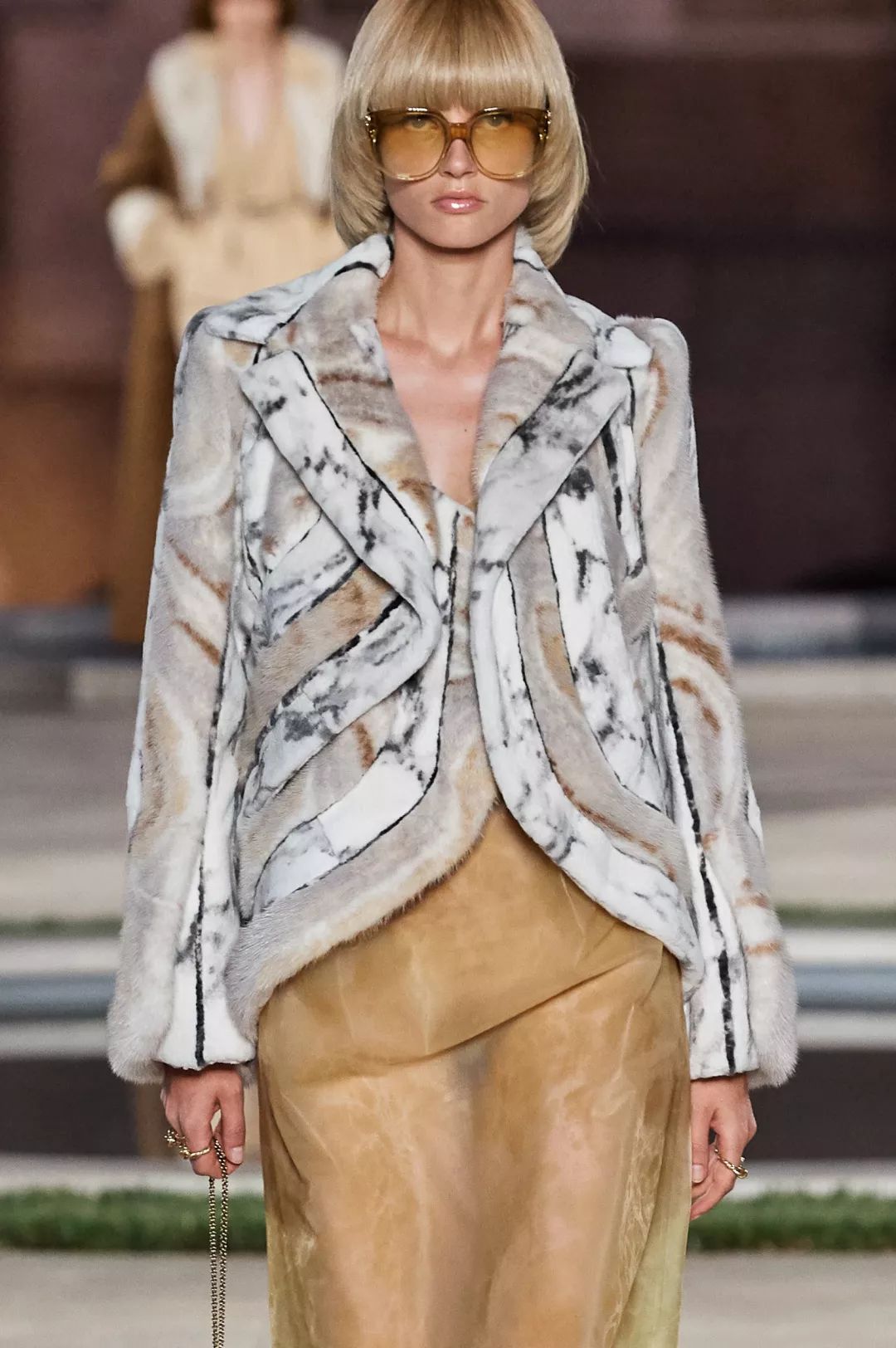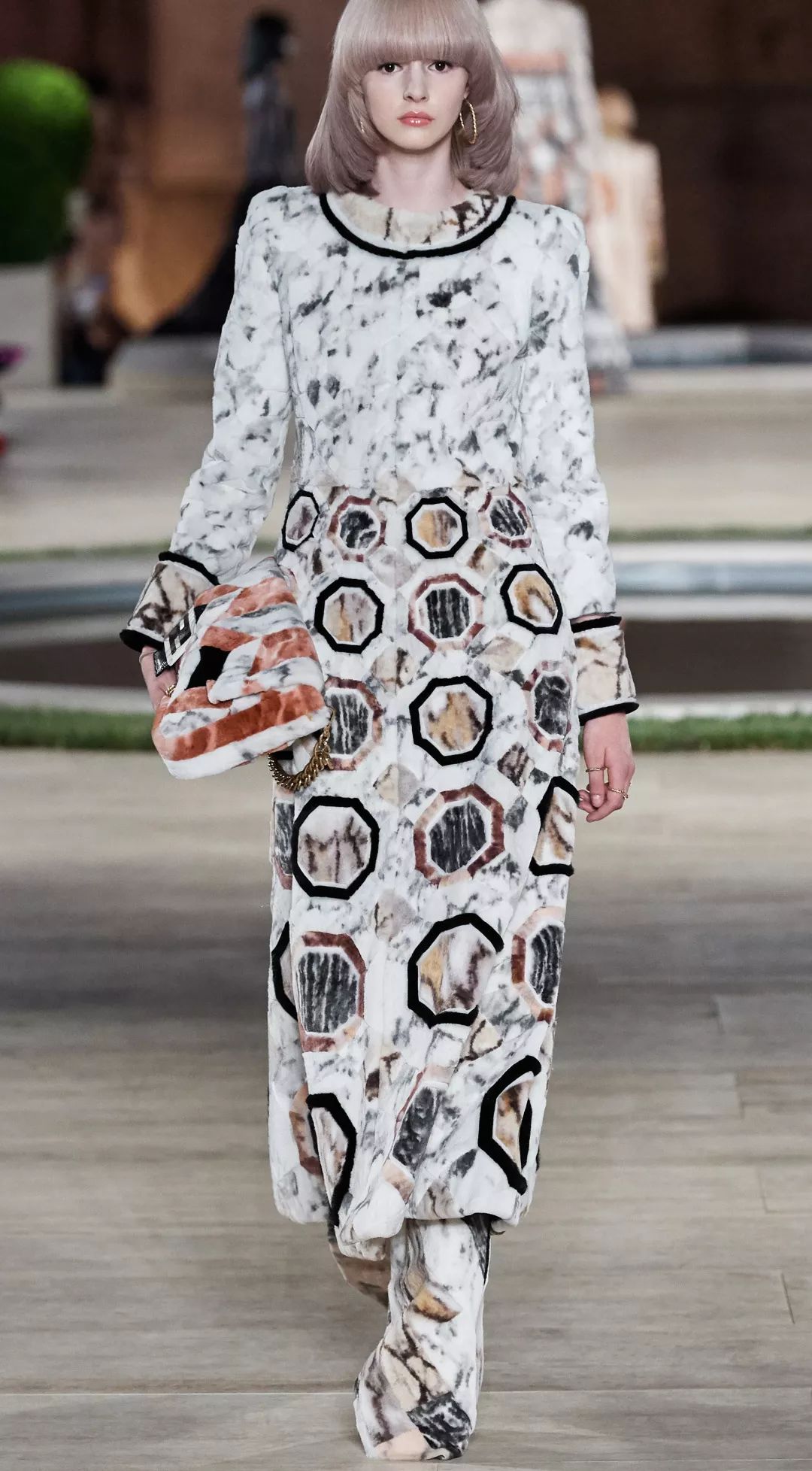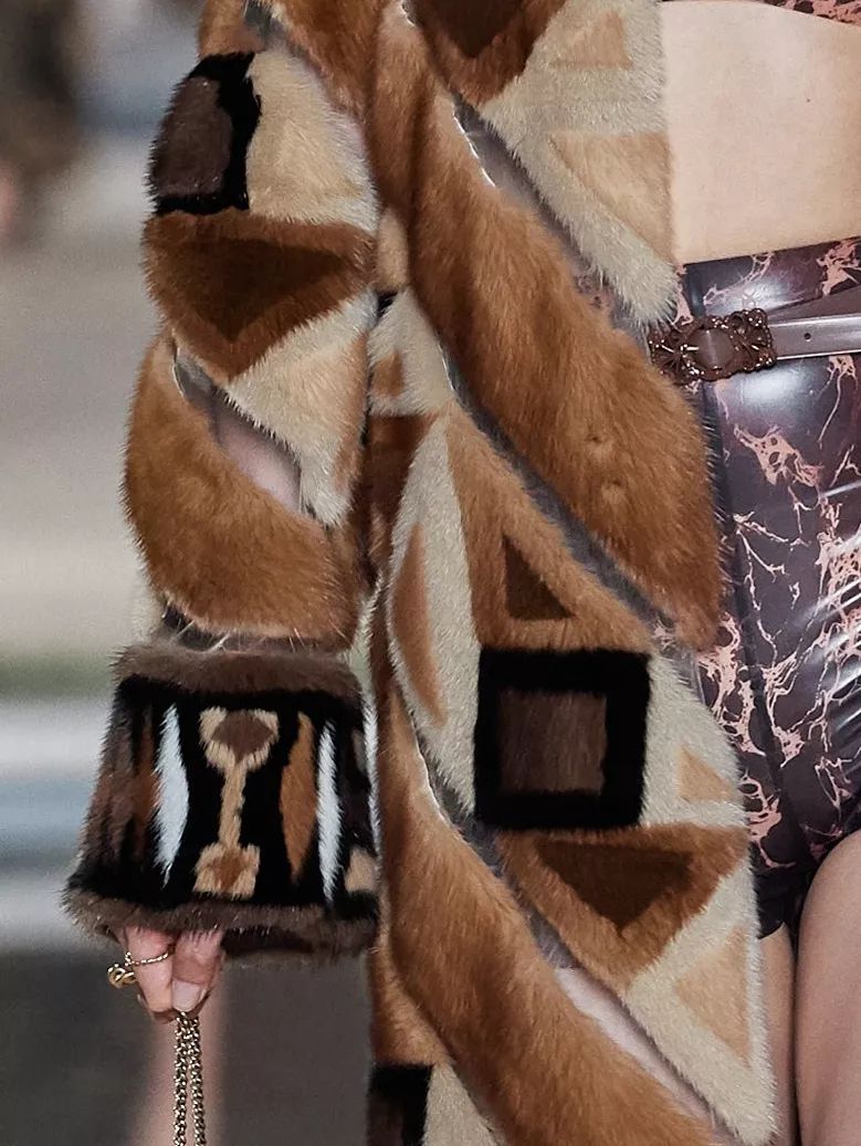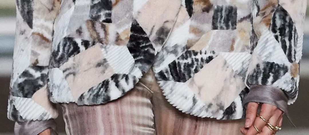 在本场发布中,FENDI对水貂剪绒后印花的工艺挑战,最终实现了完美的效果。多种色彩和纹样的仿大理石效果,完全改变了皮草的固有外观。此外,所有的仿大理石印花单品都结合了嵌花、曲线拼接、剪坑等工艺综合应用,这也是为了实现Karl曾经的标志性创新之一——Art Deco图案的效果。