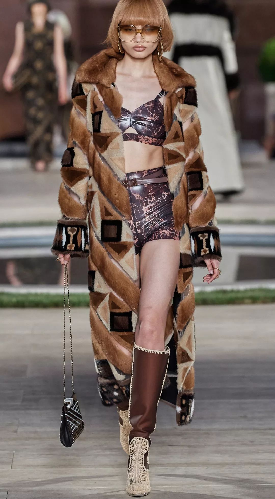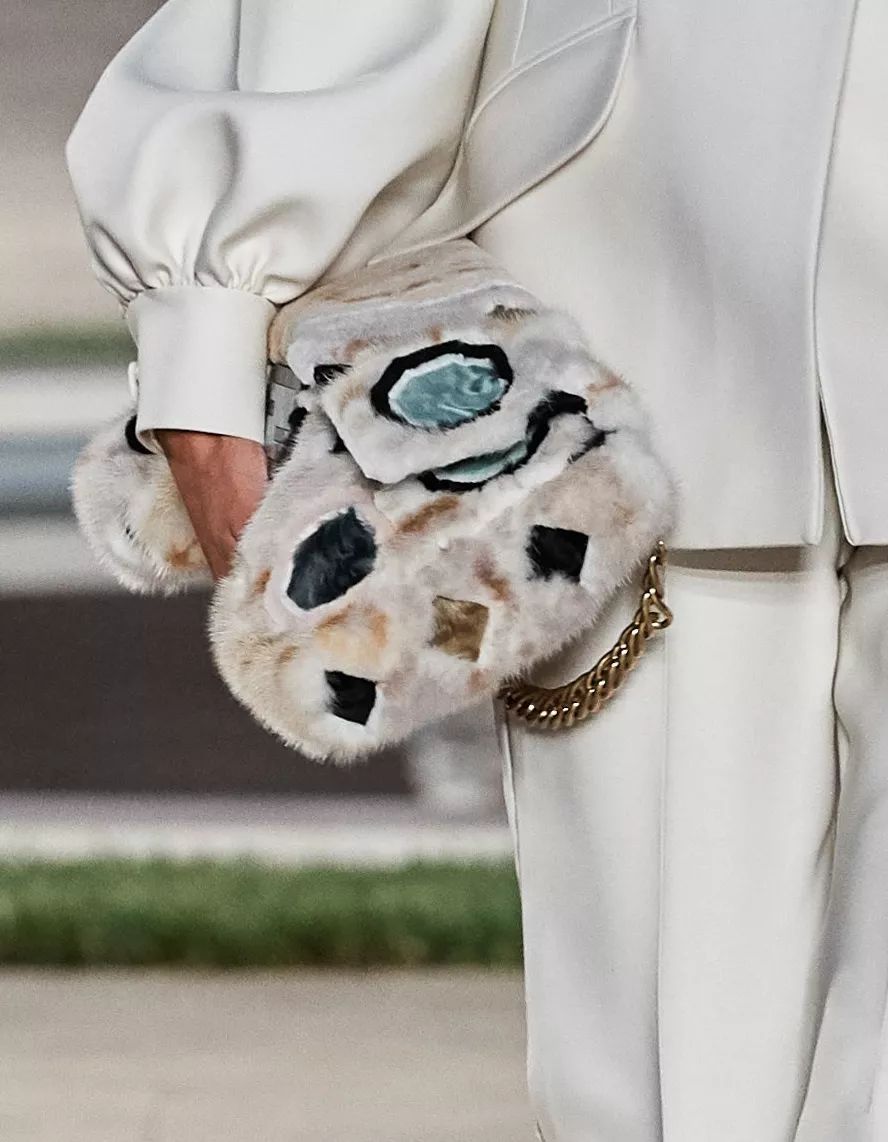 模特手中的2款FENDI经典造型手袋,均采用了嵌花工艺,图案和色彩搭配均来自意大利“文艺复兴风格”的大理石建筑,图片01的不同毛皮品种的组合,更显凹凸起伏的立体效果,而图片02的水貂采用了剪绒工艺,可以使图案显得更清晰。