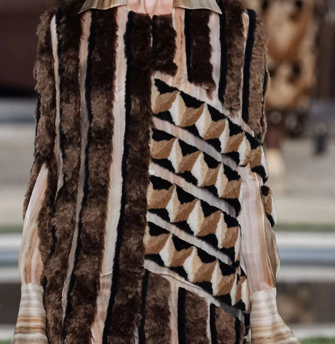 ▲FENDI 2019F Couture,剪绒水貂皮草马赛克工艺长款大衣,采用十字缝纫的马赛克工艺