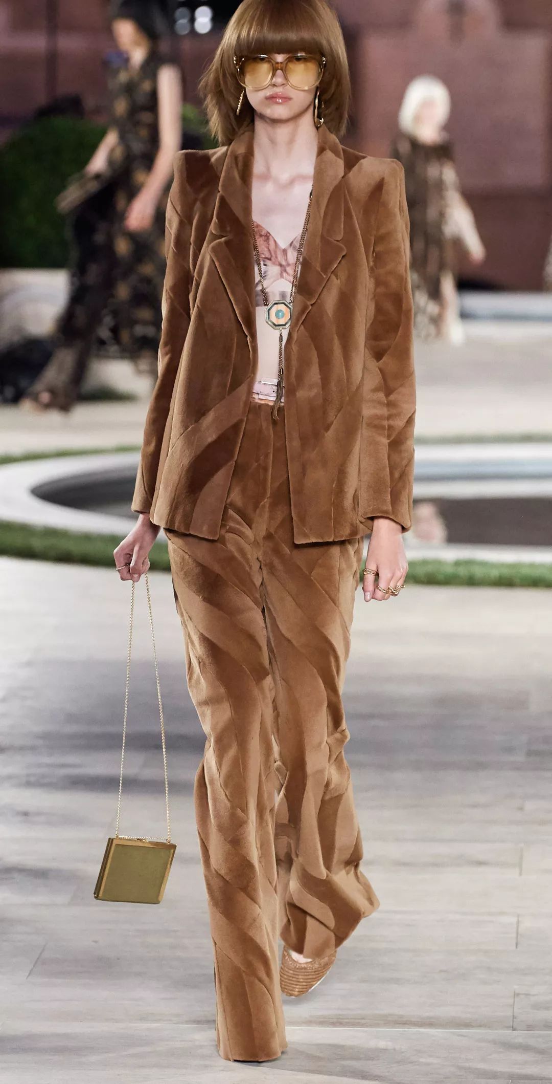 ▲FENDI 2019F Couture,咖啡色水貂西服套装,水貂剪绒,顺毛和倒毛穿插,进行不规则曲线. 双面穿