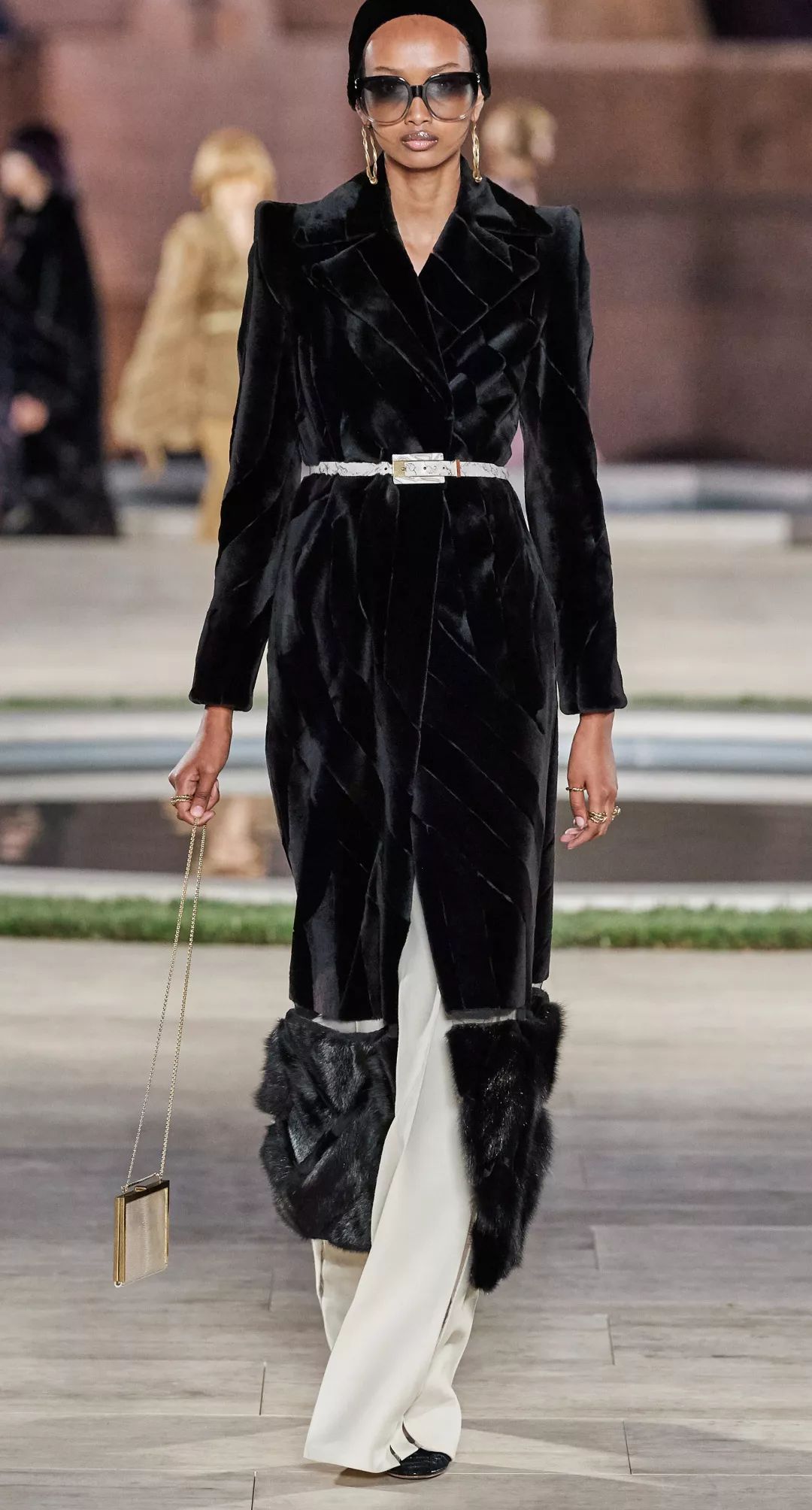 ▲FENDI 2019F Couture,黑色水貂西服领长款大衣,水貂剪绒后进行斜向条纹拼接,底摆处拼接棱形图案的水貂嵌花装饰