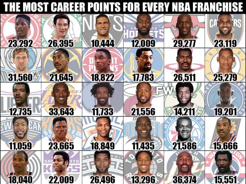 4月12日讯 今天,美媒《Fadeawayworld》罗列了NBA30队的常规赛得分王,卡尔-马龙、科比、乔丹和詹姆斯等人悉数在列。