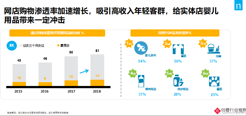 除了渠道利润之外,拉动线上渠道迅速发展的主要还是消费者,80、90后年轻消费者,在渠道选择上更愿意选择线上渠道进行消费,而收入较高的消费者在纸尿裤品牌的选择上更加愿意相信国外大品牌,也更喜欢选择线上跨境电商购买产地原装进口的纸尿裤,导致众多品牌开始转战电商,逐渐在实体店中纸尿裤失去了主导性地位。在母婴所有品类中,纸尿裤在线%。