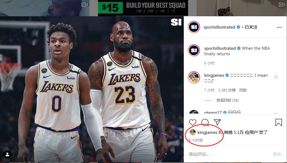 SI晒照展望NBA回归时:布朗尼来湖人了 老詹全秃了 本人点赞2020-04-12 15:23:56 Instagram4月12日讯 美国知名媒体《体育画报》在