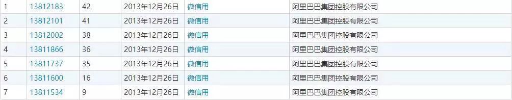 据中国商标网查询显示,2013年12月26日阿里巴巴曾在一天之内申请了7件“微信用”的商标注册,服务类别涵盖金融服务、文具家具、计算机终端通讯、娱乐出版等方面。但此后均被商标局驳回。