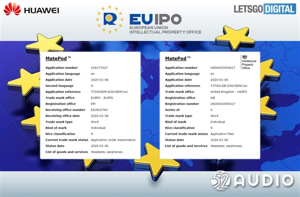 据外媒报道,欧盟知识产权办公室发表了一份公示,华为日前提交了“MatePod”商标注册申请,申请类别为Headsets/earphones耳机品类。