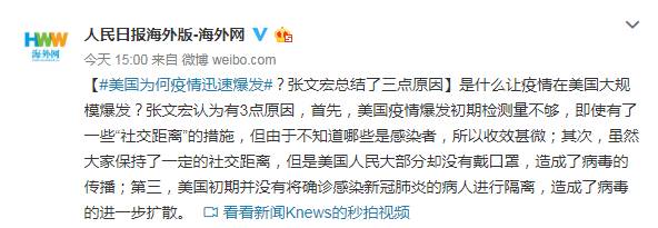 美国为何疫情迅速爆发?张文宏总结了三点原因2020-04-12 16:14:46 微博4月12日讯是什么让疫情在美国大规模爆发?张文宏认为有3点