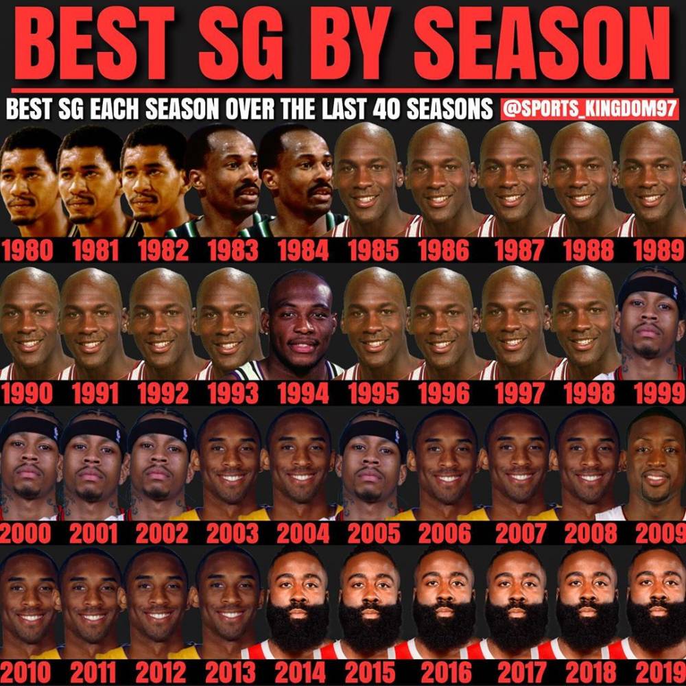 4月13日讯美媒SPORTS_KINGDOM97盘点总结了NBA过去40年赛季每一年的最佳分卫,乔丹(13次)统治了榜单,其中一度9连庄,科比(9次)排名第二,哈登(6次)第三,艾弗森(5次)第四,一起来看看吧: