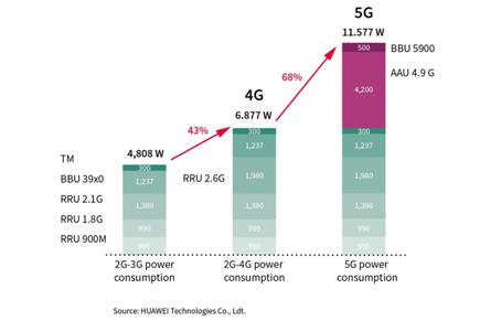 电力需求增加的原因不仅仅是由于实施5G所需的额外硬件,更强大的基站功能也增大了电力消耗。5G服务在所有方面都将超越以前的网络,将需要更高的计算能力。