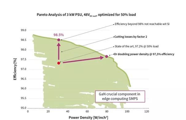 图3所示为应用帕累托分析(Pareto Analysis)得到的二维图,其中描述了在50%负载下3kW / 48V PSU功率密度和效率的所有可能组合。正如图中所表明的那样,与最先进的硅MOSFET解决方案相比,在电源转换中使用英飞凌CoolGaN器件能够实现更高的效率、更高的功率密度或两者的结合。