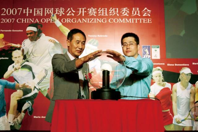 2007年4月10日,北京,国家体育总局网球管理中心副主任高沈阳(左)、新浪网副总编辑侯小强启动2007年中国网球公开赛官网