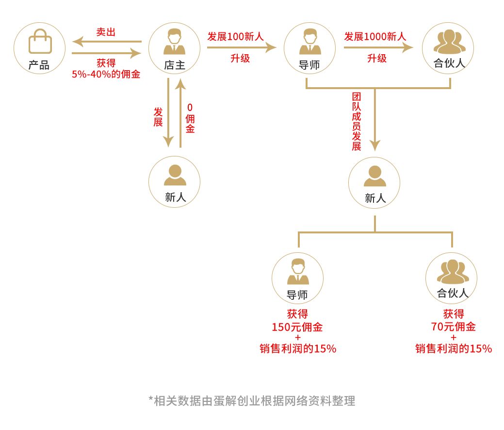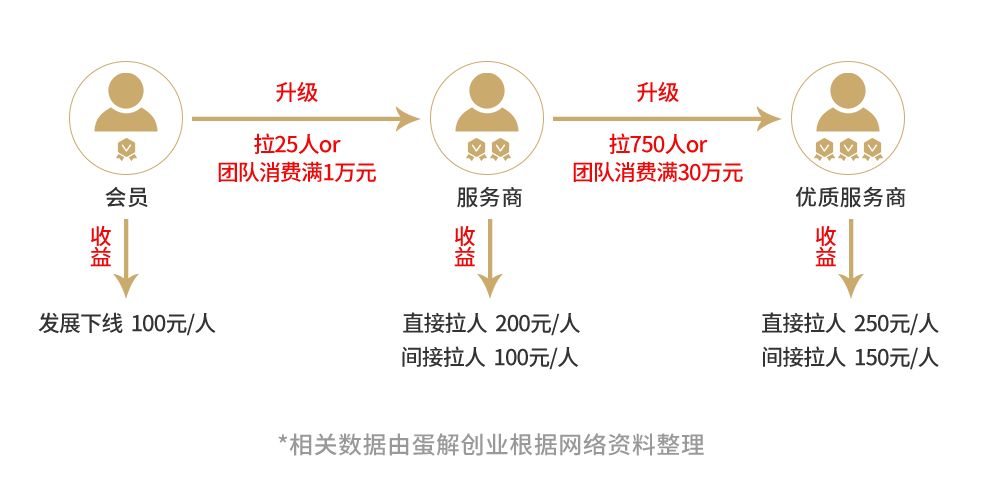新人加入不需要“平台服务费”,变成了购买“注册大礼包”,团队层级改为店主—主管—经理。店主发展新人仍然没有佣金,但可以获得40云币,被邀请人获得20云币,1云币相当于1块钱人民币,可在平台消费。主管有150元的收益,经理可获得80元,是为“培训费”。同样,主管和经理都能获得商品销售利润15%的收益,是为“服务费”。主管和经理需要和云集签劳务合同,每月15号统一发放上个月的收益。如此,发展下线返佣就成了公司给员工的报酬,规避法律风险。