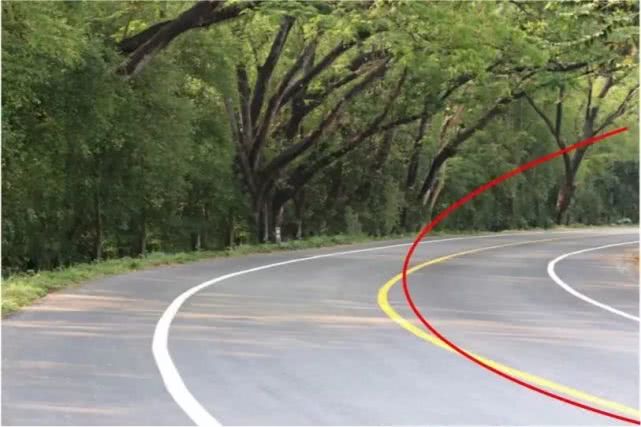 2、我们来看图2,图中是一条半径比较小的弯道。我们看这个图片上的弯道可能没感觉,但是如果在现场,一些新手要是开车来到这个地方的话,就有可能会把这个弯道看成红色的这条线。