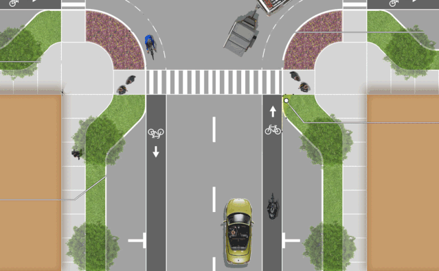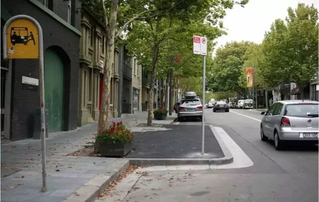 把人行道在路口加宽,车辆行驶的道路变窄,我们把这个技术叫缘石延展。 把缘石往路内增加了以后有什么好处呢?司机靠近路口的时候视线一般都是往前看,视线往前看的时候,较为清晰的区域差不多是眼前三十几度的跨度,余光是不清晰的。 在这个位置,如果是没有加宽的人行道的话,站在路边的行人实际上是在司机较为清晰的视区之外。那么司机要看到行人,就需要转头看,就算他以很快的速度转头过去,有关人因的统计认为,这个动作要花0.8秒的时间。 0.8秒是个什么概念?一脚油门十米就开过去了。这样是不是很危险?所以我们要减少这0.8秒的时间,让行人再靠里面一点,就不需要司机再转头看。这样就省了十米的距离,整个交叉口就变得安全了,对行人来讲,过马路的距离也变短了。缘石延展的技术用到的地方还很多,比如公交车站。图16中这个公交车站也利用了缘石延展的技术。做了这样一个突出来的缘石以后,可以保证路过和等候的行人都有足够的空间体面地去坐公交,也方便公交车对准缘石,紧贴着缘石的边缘停下来,方便乘客一脚就跨上去。
