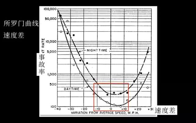 在速差较小的情况下,其实路上的事故率是比较低的。前面提到的这块牌子实际上是人为制造了速差。为什么要制造这样的速差呢?当然我们一直以来的道路状况并不好,所以有各种各样合理的理由去制造这样的速差。 即便如此,我们还是要去思考,人为制造速差会不会本身也会带来问题?从所罗门曲线的这张图里面,我们还能得出一个结论:开得慢不一定安全,开得跟人家一样快才能保证整体的安全。