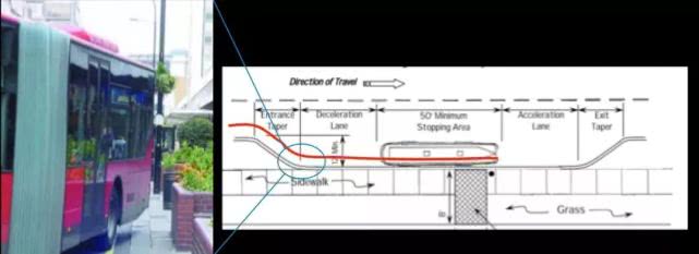 减速车道跟加速车道有两个缓冲区。这两个缓冲区有什么好处呢?就是司机开过来的时候可以慢慢地靠近,然后在缓冲区调整速度,调整车头的位置,这样车才可以贴近路边,靠近公交站。