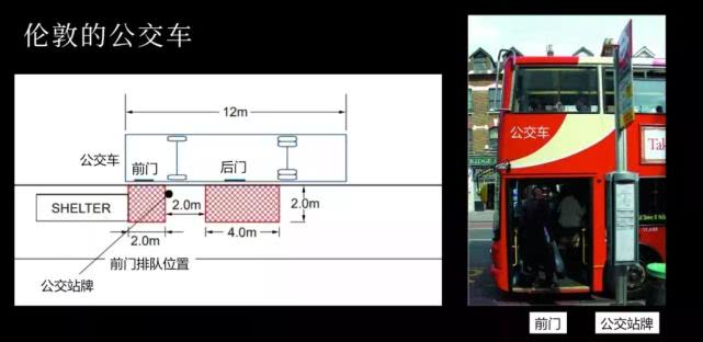 公交站的等候位置也是有讲究的。实际上,在伦敦的公交设计手册里面就有这样的规定,前门应该在哪个位置,后门应该在哪个位置,如果是三节的车,中门应该在哪个位置。