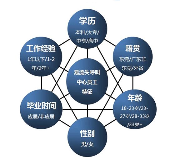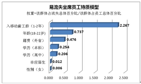 另一个方面,随着中国劳动力可供应人口的减少和人口红利的消失,当前呼叫中心面临的最核心问题之一是如何降低流失率而非寻找最优秀的员工,所以东莞中心管理层采用逆向思维的方法并借鉴知识模型构建的思路,确定研究出“易流失员工”的特征: