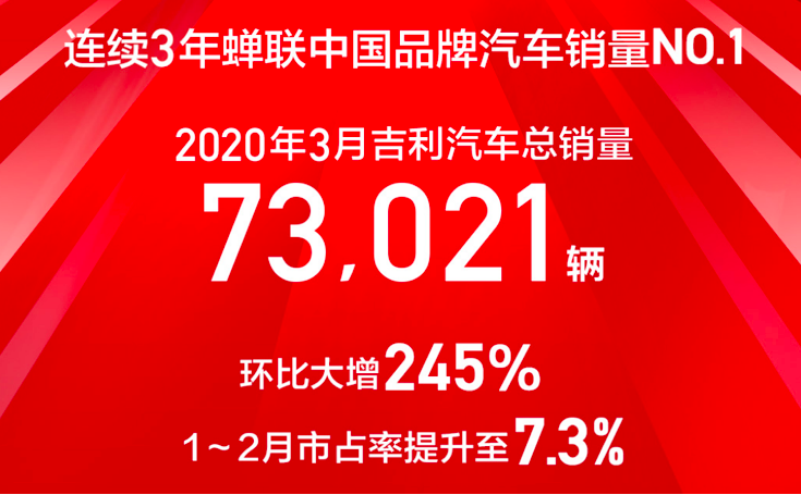 4月7日,吉利汽车发布了3月份销量数据,3月企业总销量为7.3万辆,环比暴涨245%,一季度累计销量为20.6万辆,虽然同比依然下滑,但回暖势头非常明显,仍位列中国品牌销量冠军,更是拿下3月车企销量排行榜亚军位置。