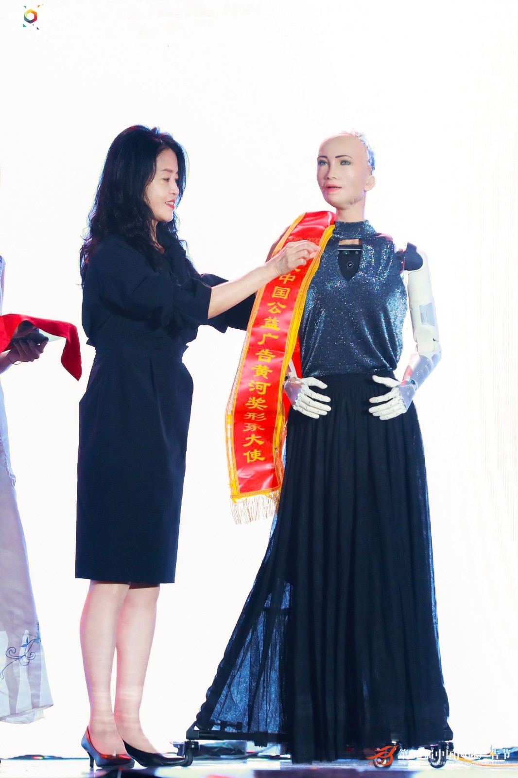 值得一提的是,神秘嘉宾——AI智能机器人索菲亚空降颁奖现场,引起了观众阵阵掌声。她发表了“人类与机器人共建美好社会”的感言,并与主持人进行了欢乐的即兴对话,展现AI科技魅力。随后,中广协秘书长王英偶在现场为索菲亚进行了代言人绶带。