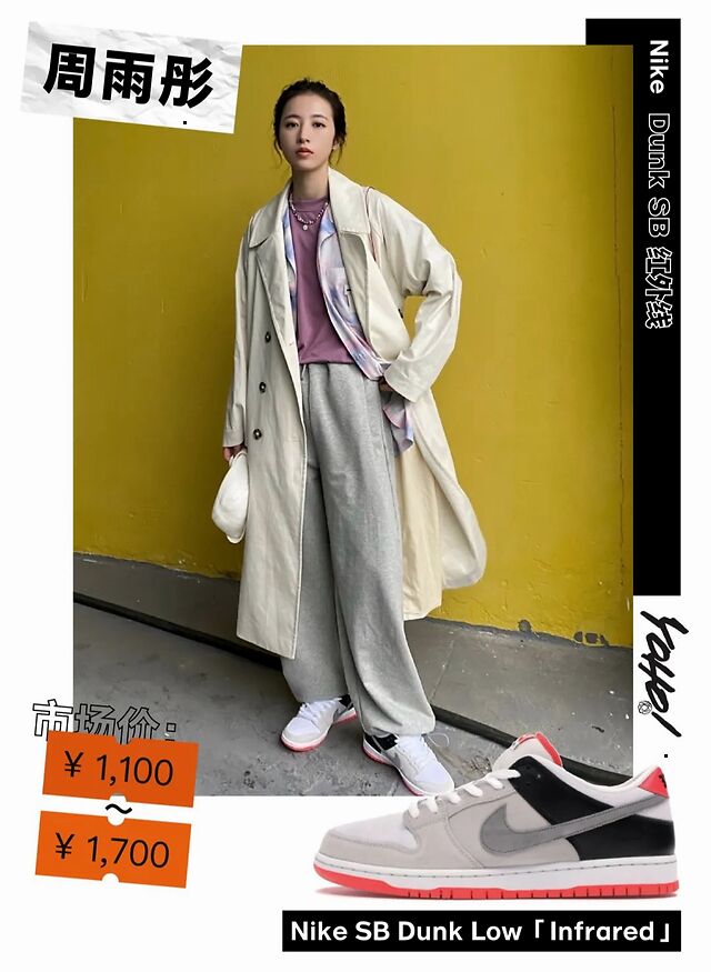 人气小花周雨彤最近则上脚了「红外线」配色的 Nike SB Dunk,AJ 的经典配色加上大热的 Dunk SB 鞋型,的确非常诱人,现在价格还挺稳定的,喜欢的朋友可以入手一波。