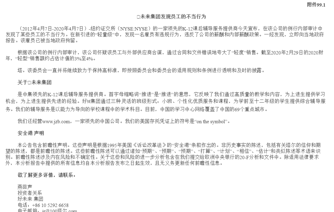 好未来公告称,称根据公司的例行内部审计,怀疑某些员工与外部供应商合谋通过伪造合同和其他文件的方式虚假地推高“轻课”销售额。在截至2020年2月29日的2020财年,“轻课”销售额约占好未来总营收的3%到4%。