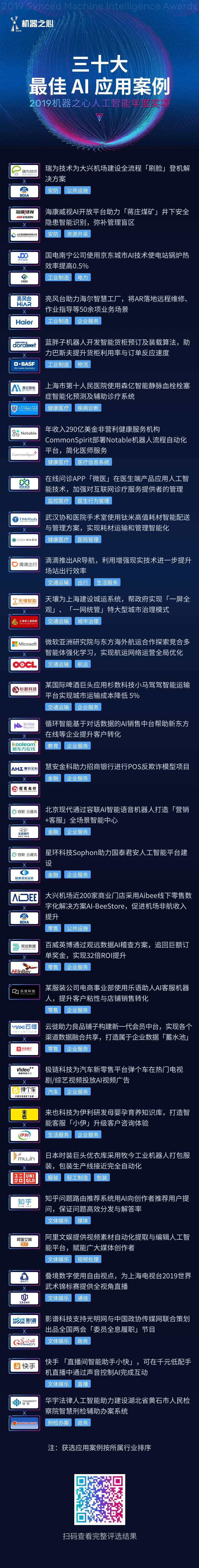 注:机构奖项获选企业按首字母排序、获选产品/解决方案按所属智能领域排序、获选应用案例按所属行业排序、最值得关注资本事件按时间顺序排序