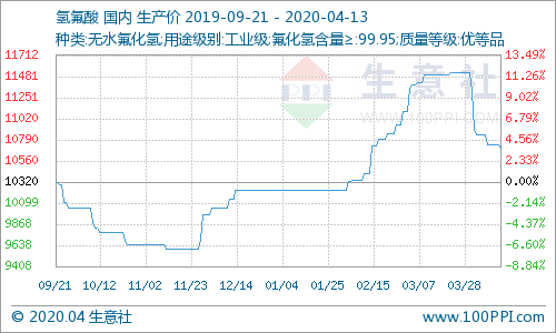 近期国内氢氟酸开工率在6成左右,企业反映目前场内氢氟酸现货货源供应充足,但是下游行情不佳,对于氢氟酸市场需求减弱,近期由于下游行情价格回落,加之上游萤石价格走低,国内氢氟酸市场价格持续下滑,近期大部分厂家反映氢氟酸亏损严重,综合来看,受利空影响国内氢氟酸市场价格大幅回落。近期终端下游制冷剂市场交易行情回落,近期全球受卫生事件影响严重,进出口行业受到严重冲击,制冷剂行业行情下滑,国内R22开工率较低,国内制冷剂R22市场价格有所回落,厂家生产装置开工仍处于低位,市场货源供应能力正常,下游空调生产厂家采购不积极,需求有所减少,国内大企业价格主流下滑至15000-18000元/吨水平。国内R134a市场价格走势下滑,生产企业装置开工率维持低位,目前汽车行业生产有所下滑,R134a需求减弱,而目前市场内R134a供应正常,价格走势维持低位,下游行情有所下滑,氢氟酸市场价格走势大幅回落,加之北方萤石供应逐步增加,预计后期氢氟酸市场价格或将持续下滑。