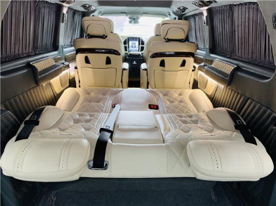 奔驰威霆改装后排座椅则为电动三连坐的沙发座椅,柔软程度更升一级,非常适合老幼妇孺乘坐,更能支撑一键电动平躺,座椅和软床的合二为一,让车内乘客能够有用的缓解出行以及游玩嬉戏后的疲劳感。